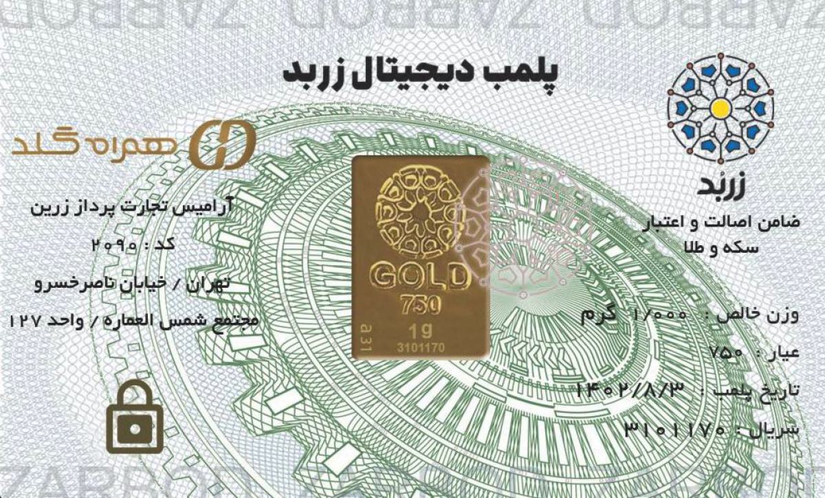 شمش طلا یک گرمی زربد (۱ گرم) با پلمپ امنیتی دیجیتال